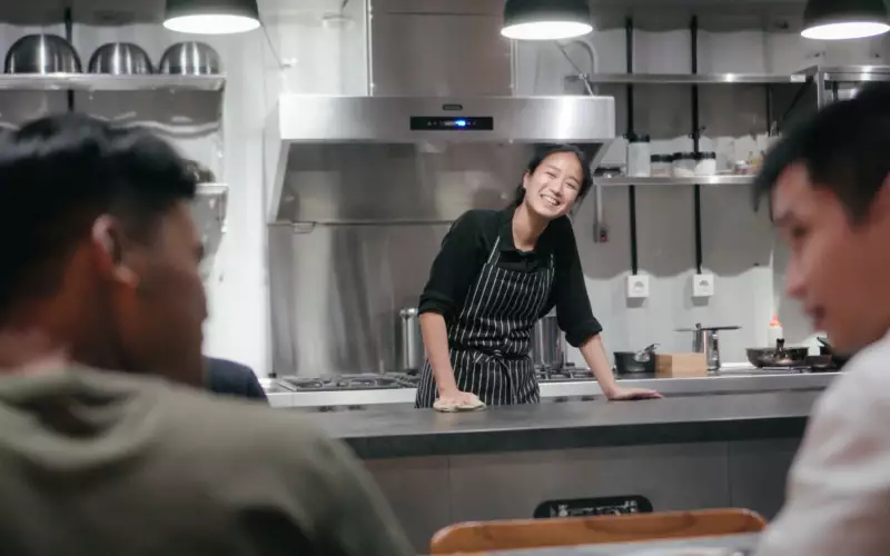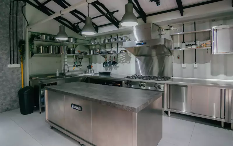 Everything centers around the 6-hobs gas range, with additional preparation tables on the left and right. The exhaust hood features a touchless operation system, which allows total control of the ventilation via proximity sensors. The island across the stove acts as the pass as well as the garnish station.
