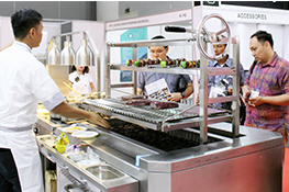 Nayati collaborated with Restomart in displaying the service-focused front cooking concept, this is constructed of colored stainless steel with LED illumination. The module contains various cooking apparatus that is easily changeable on site. Series of refrigeration under counter with drawers are lined up to simulate a preparation counter with island fittings. New Meritus 750 series is the highlight of the modular cooking display alongside the Gourmet Master Kitchen Block that absorbed numerous attention from turnkey visitors.