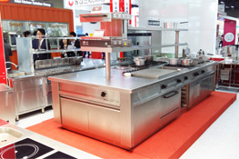 Cooperating with HKC, Nayati Exclusive Partner based in Seoul, a situation of genuine kitchen layout was presented to the customers. A Kitchen Block Gourmet Master with a double over shelf and assembled around the gas powered cooking modules.